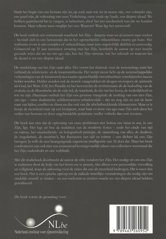 De ontdekking van het Zijn raakt alles. Het vormt het sluitstuk voor de wetenschap, want het verbindt de relativiteits- en de kwantumtheorie. Het werpt nieuw licht op de wetenschappelijke verkenningen van de kwantumfysica waarin ogenschijnlijk onverklaarbare verschijnselen ineens helder worden. Helder worden ook de morele vraagstukken als deugen en respect; de spirituele als God, het Ware Zelf, het Paradijs en het bewustzijn; de evolutionaire als de bedoeling van de evolutie en de filosofische als de vrije wil, de waarheid, de zin van het leven, de werkelijkheid en wie we zijn. Daarnaast onthult het Zijn ons grootste vraagstuk: de werking van ons niet-Zijn, ons ego – onze dualistische zelfdestructieve schaduwzijde – dat we nog zijn en aan de basis staat van lijden, conflict en chaos en dus ook van die afschrikwekkende klimaatcrisis. Maar er is hoop: de mensheid staat op een kruispunt, waar haar evolutie van ego naar Zijn zich door het verlies van houvast en door ongebreidelde polarisatie sneller voltrekt dan ooit tevoren.